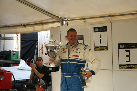 Sideløbende med hjælpen til Christer Gislerud havde mekanikerne nået at ændre bilernes opsætning til eftermiddagens solskin og tørre bane, og brødrene Klostermann var klar til at dyste mod Jørgen Hansen og Mikael Sode, der har fået Sleipner til at køre godt. Da starten gik, blev en bil midt i feltet stående på gridden, og en række af uheldsfaktorer begyndte at stå i kø for at skabe den mest bizarre episode i mange år: en Safety Car for fuld fart mod kørselsretningen – baglæns vel at mærke! Det skete der ikke noget ved, så bilen blev parkeret ved siden af den holdende racerbil. – Jeg så der var gult flag og SC-skilt, og samtidig fik jeg at vide over radioen, at jeg skulle tage inderbanen ind på langsiden. Da jeg så kom rundt i svinget, var der pludselig en mand med to gule flag foran barrieren, og inderbanen var spærret af Safety Car, så jeg måtte trække til venstre, og der blev jeg ramt af Michael Nissen. Min bil blev sparket frem og der var ikke mange centimeter til manden med flaget, fortalte en rystet Claus Klostermann efter løbet.