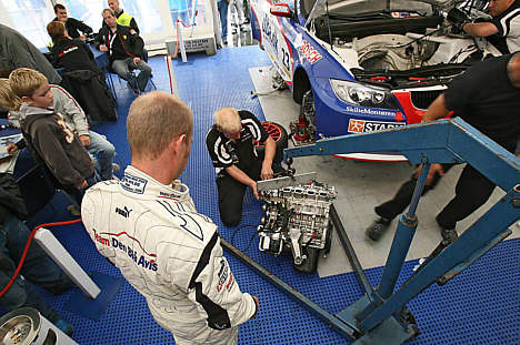Stemning fra Copenhagen Racing Grand Prix 48 minutter. Så kort tid tog det Team Den Blå Avis’ mekanikere om at skifte motoren i Jan Magnussens BMW efter opvarmningen søndag formiddag. |