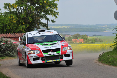 Med Horsens Fjord i baggrunden tordner Kim Madsen og Kasper Sørensen gennem landsbyen Skjold på vej mod sjettepladsen i Tegee Dan Rally i deres Mitsubishi Lancer Evo 7. (Foto: Michael Eisenberg)Kim Madsen og Kasper Sørensen var involveret i en hård dyst med to andre Mitsubishi-kørere, Steen Andersen og Iben Louring fra København samt Jens Chr. Pilgaard og Carsten Bjerregaard fra Holstebro, som begge måtte trække sig med tekniske problemer.