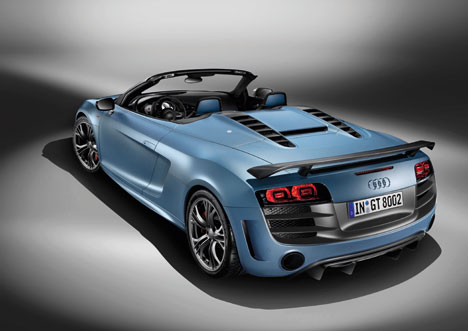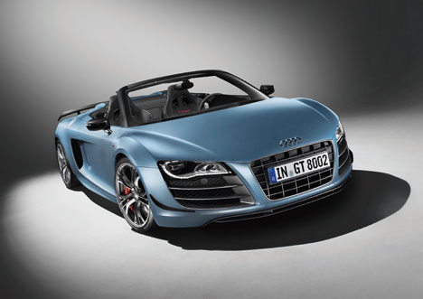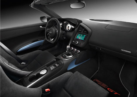På klassisk Audi maner er R8 GT Spyder udstyret med en let softtop af stof, som kan åbnes og lukkes i løbet af 19 sek. – endda ved en hastighed på op til 50 km/h. Bagruden af glas, der kan køres ud, er placeret forsænket i bagvæggen adskilt fra kalechen. Bagvæggen omfatter et styrtbøjlesystem, som består af to forspændte plader. Den 5,2-liters V10-motor leverer 540 Nm drejningsmoment ved 6500 omdr./min., og den maksimale ydelse udgør 560 hk.. R8 GT Spyder accelererer fra 0-100 km/h på 3,8 sek., og har en tophastighed på 317 km/h Audi leverer R8 GT Spyder med en automatiseret 6-trins gearkasse R tronic som standard, og den omfatter to fuldautomatiske indstillinger. I den manuelle indstilling kan føreren desuden skifte gear med skiftekontakterne på rattet eller ved at vippe joysticket.
