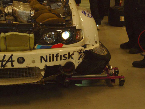 Herefter var alt igen ok og bilen kørte perfekt, desværre skete det så at en af kørerne i forbindelse med en overhaling af en langsommere bil kommer lidt ud af sporet og spinder sidelæns ind i en betonmur, bilen bliver efter ca. 40 min fragtet ind i pitområdet hvor vi kan begynde genopbygningen , der er skader på hjulophæng for og bag samt skærme og kofangere og det tager yderligere 2 timer at få bilen klar igen.