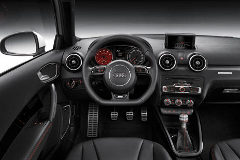 Interiøret i Audi A1 quattro domineres af en sportslig og kølig sort farve. Sæderne og armlænene i dørene er betrukket med læder af typen Seidennappa, og de røde syninger skaber en kontrast. S-sportssæderne foran har markante sidestykker, integrerede hovedstøtter og en ryglænsafdækning med quattro-logo på bagsiden. De kan indstilles i mange forskellige retninger. Midterkonsollens nederste del skinner i sort højglans, mens fodstøtten og pedalkapperne er fremstillet af børstet ædelstål. Måtterne er forsynet med røde kantbånd, og panellisterne har A1 quattro-modelbetegnelser.