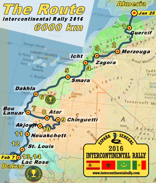 Sådan forløber årets udgave af det 6.000 kilometer lange Intercontinental Rally 2017 fra Almeria i Spanien til Dakar i Senegal. Foruden transportetaper skal der køres nedenstående distancer, som er afgørende for slutresultatet: