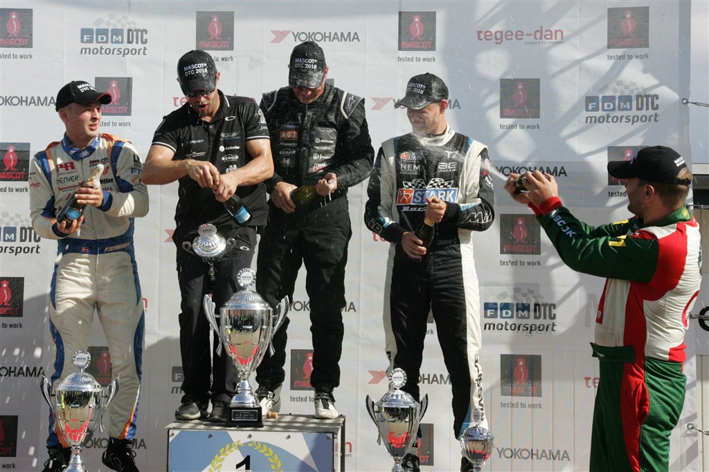Mens en repræsentant fra Racing Factory, vinderen Ronnie Bremer og treeren Kasper H. Jensen i midten kæmper med champagneproppen, sørger løbets toer Frederik Schandorff og vinderen af MASCOT Cuppen Henrik Nøhr for, at de blev våde (Foto: Henning Smed)