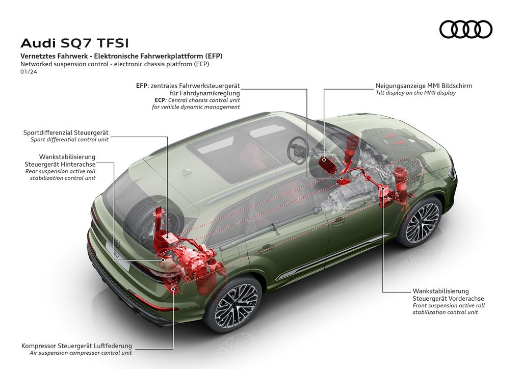 Adaptive air suspension sport varierer karrosseriets højde med op til 75 mm afhængigt af førerens ønske og situationen – og omfatter også niveauregulering. Ved motorvejskørsel udfører systemet automatisk en hastighedsafhængig sænkning med op til 15 mm. Ved terrænkørsel kan man ved lave hastigheder vælge op til 60 mm ekstra frihøjde via funktionen ”lift” i Audi drive select. Desuden sikrer firehjulsstyringen øget sikkerhed og komfort. Ved lave hastigheder drejer baghjulene op til 5 grader i modsat retning af forhjulene. Det reducerer vendediameteren med op til 1 m, og bilen bliver nemmere at manøvrere med.