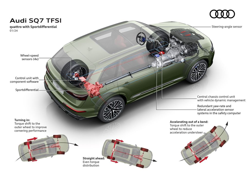 SQ7 nyder naturligvis godt af Audis DNA, når det gælder køreegenskaberne. Fem elementer er definerende for køreegenskaberne: afbalancering, robusthed, kontrol, præcision og ubesværethed. Undervogn, styretøj, drivlinje, bremser og reguleringssystemer spiller i den forbindelse en hovedrolle for at opnå en vedvarende sikker, suveræn og komfortabel køreoplevelse. Samtidig må SQ7 trække en anhængervægt på op til 3,5 ton.