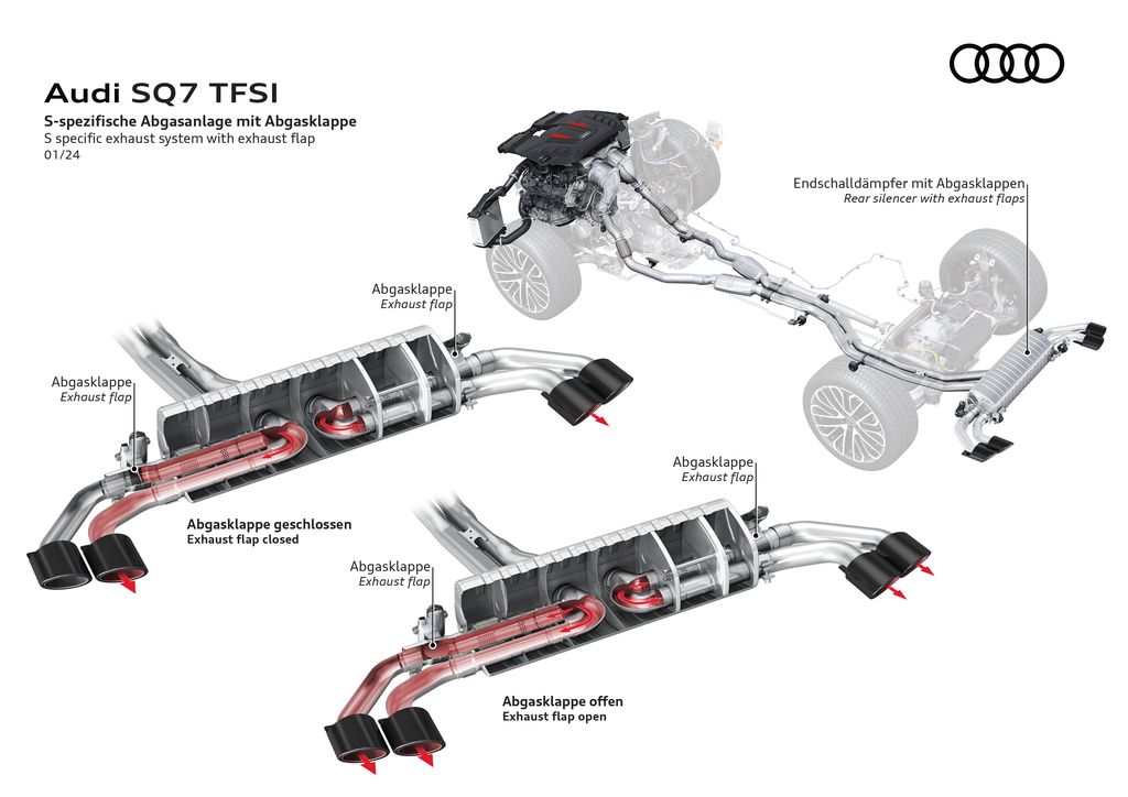 Siden 2020 har SQ7 været udstyret en TFSI-benzinmotor i stedet for en diesel, og med denne opgradering er det fortsat den velkendte 4,0-liters TFSI-motor med 507 hk og et drejningsmoment på 770 Nm med en hurtigt skiftende 8-trins tiptronic og permanent quattro-firehjulstræk, der trækker den store SUV. Dermed accelererer motoren fra 0-100 km/t på kun 4,1 sek., og tophastigheden er begrænset til 250 km/t. Takket være tændingsrækkefølgen 1-3-7-2-6-5-4-8 udvikler 4,0-liters TFSI-motoren en markant sportslig lyd.