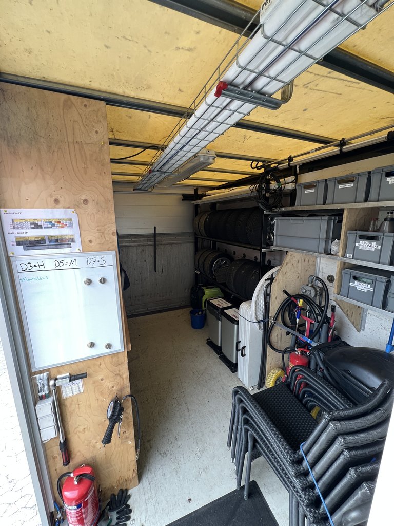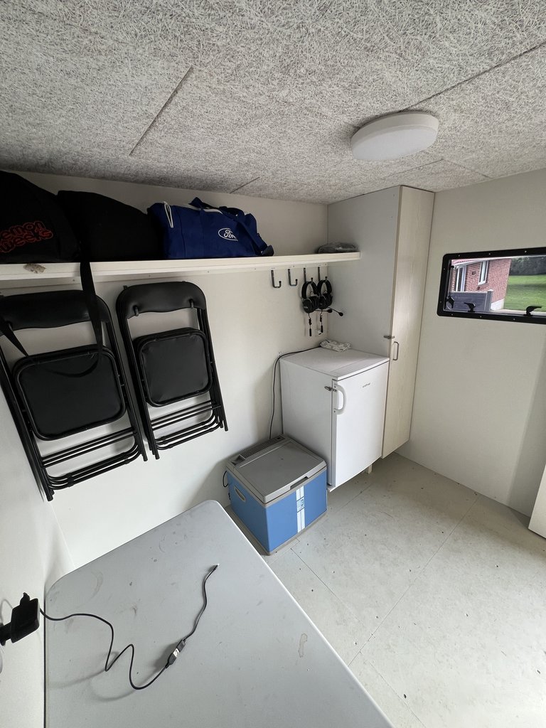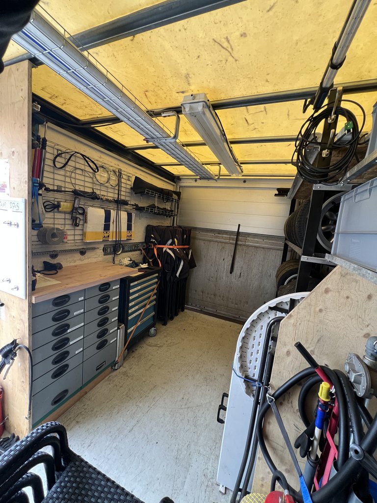 • Der er indbygget værkstedsbord og hylder samt net på væg til reservedele