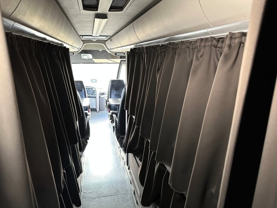 Helbeklædte lædersæder for 10 passagerer plus chauffør. 8 af sæderne er grupperet omkring 2 borde. Ekstra sæder medfølger, hvis man ønsker en anden konfiguration.