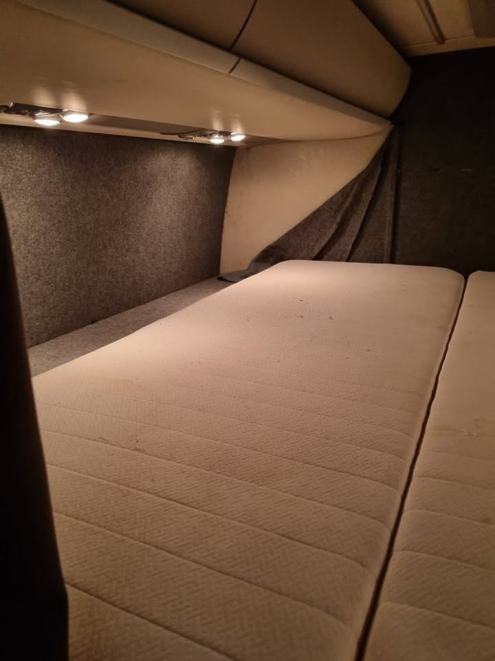Den er kun lige kørt til med 77x.000km, 15 meter lang, har plads til en racerbil, telt, masser af værktøj/udstyr og 11 personer inklusiv chauffør.