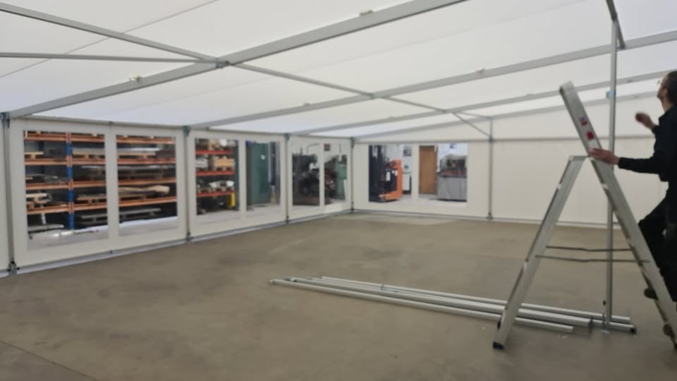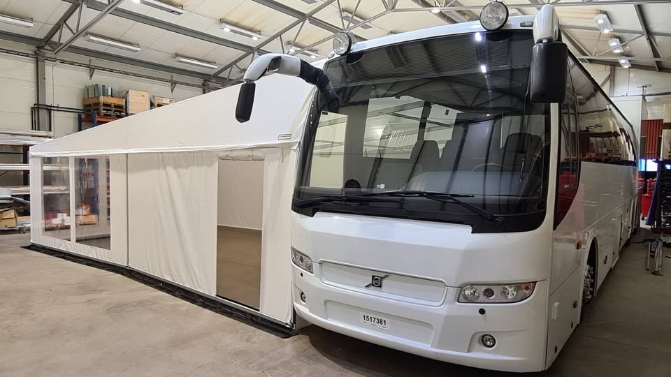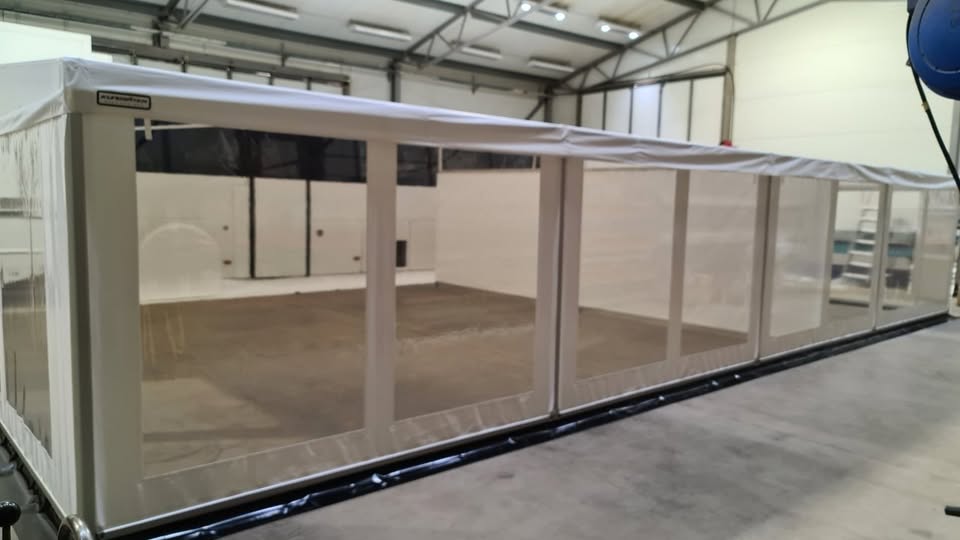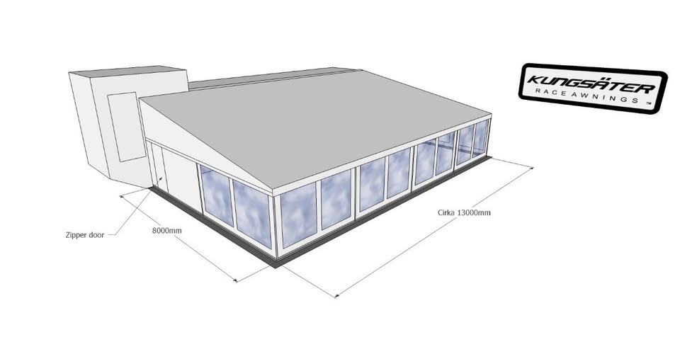 Fabriksnyt (max brugt 5 gange) kæmpe specialbygget 12x8 meter telt bygget på fabrikken i Sverige af Kungsäter Race Awnings. Når det er sat op, står det helt stramt, fladt og uden rynker, og altså ikke som en gammel slatten pressening! Ingen branding eller reklamer er sat på teltet. Teltet alene kostede + 125.000 + moms.