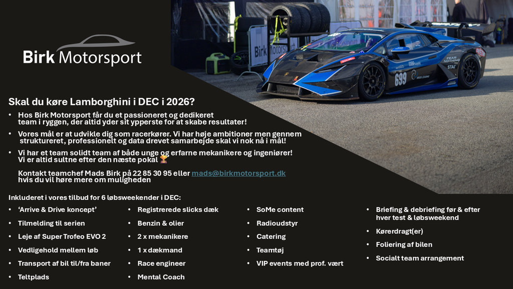 Er du interesseret og vil vide mere? Så kontakt teamchef og ejer Mads Birk og få en snak om dine muligheder hos Birk Motorsport!
